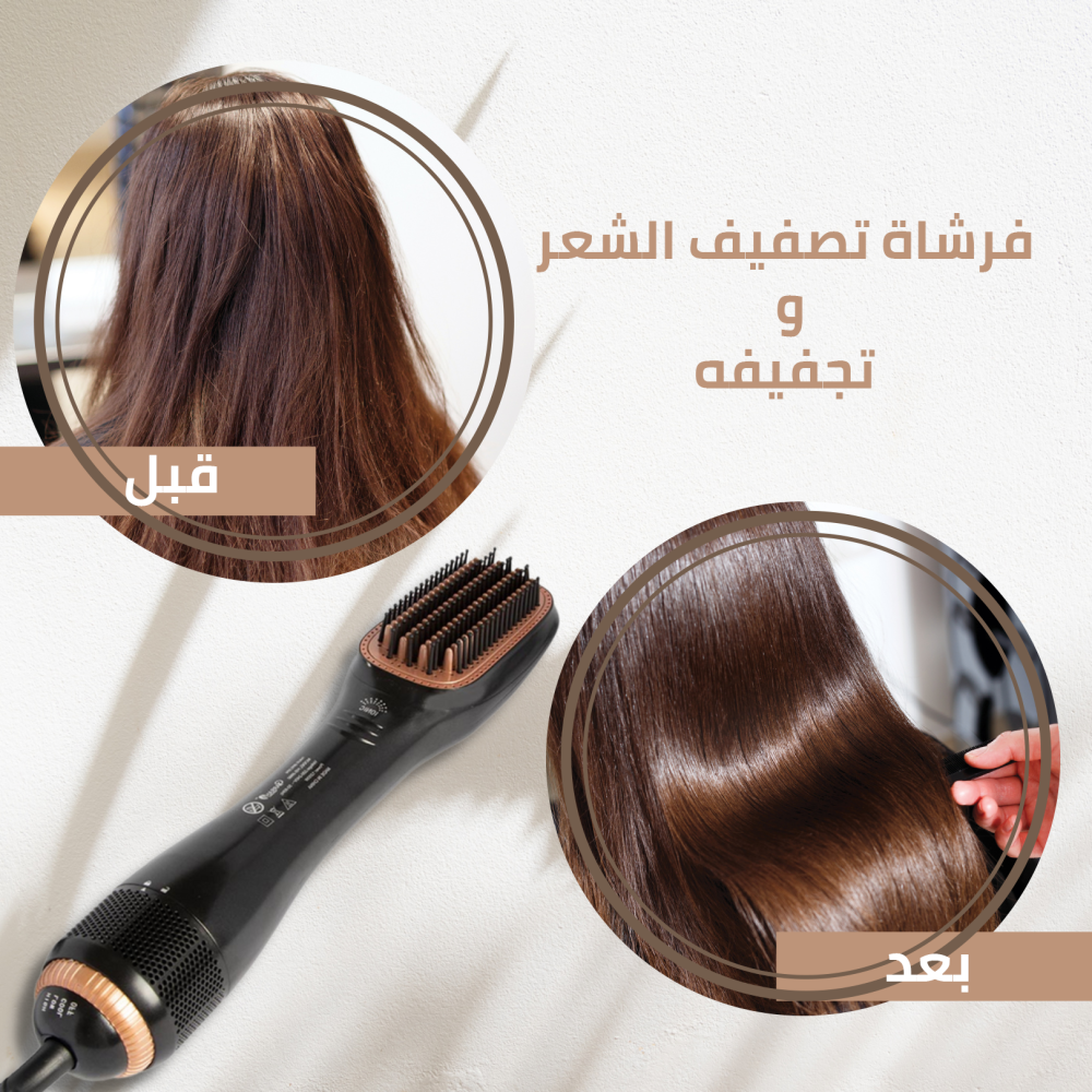 - جهاز يجمع تجفيف الشعر عن طريق دفع الهواء الساخن والبارد مع فرشة الشعر برؤوس معدنية ساخنة لتصفيف الشعر
